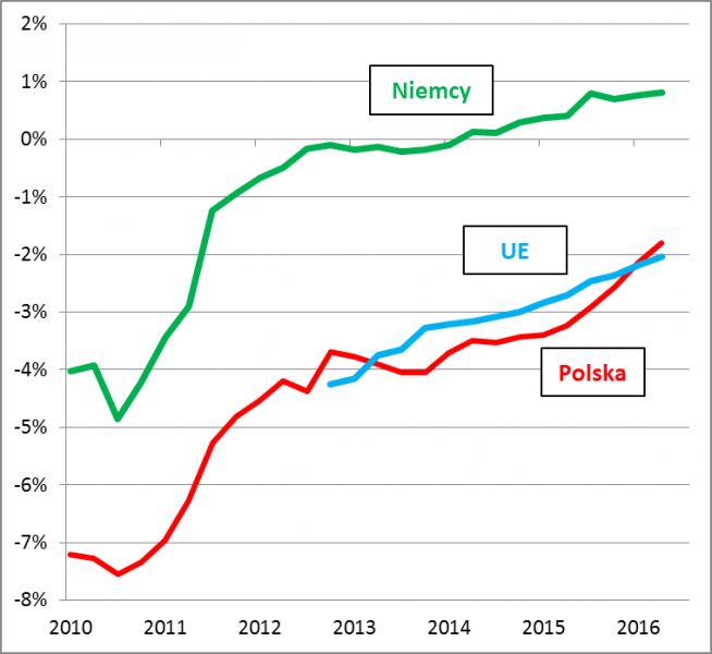 O zmianach poziomu zadłużenia w relacji do PKB decydują w ostatecznym rozrachunku dwa czynniki: tempo wzrostu PKB oraz deficyt budżetowy (częściowo zależny także od PKB). Pokrótce przyjrzyjmy się tej drugiej kwestii. Dobra wiadomość jest taka, że wg Eurostatu deficyt finansów publicznych w Polsce zmalał w ostatnich czterech kwartałach do 1,8 proc. PKB – to poziom najlepszy od lat. Kluczową rolę odgrywa tu widoczny zwłaszcza od III kw. 2015 r. szybszy wzrost przychodów budżetowych. A gorsza wiadomość? Polska, mimo relatywnie szybkiego wzrostu PKB, nie należy do czempionów, jeśli chodzi o tempo redukcji deficytu. Pod tym względem jesteśmy po prostu unijnym „średniakiem”, natomiast daleko nam np. do Niemców, którzy notują nadwyżkę budżetową.