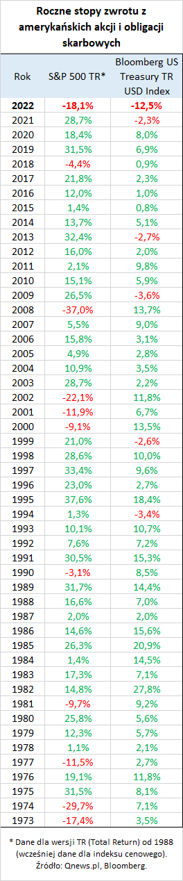 Jednoczesne straty z akcji i obligacji w półwiecznej historii danych widocznych w tabeli to coś zupełnie bezprecedensowego, a co dopiero dwucyfrowe straty z obu tych głównych aktywów! Wbrew tradycji tym razem nie zadziałała prosta dywersyfikacja portfela, dzięki której ewentualny spadek wartości któregoś z aktywów był przynajmniej częściowo buforowany przez drugą klasę instrumentów.