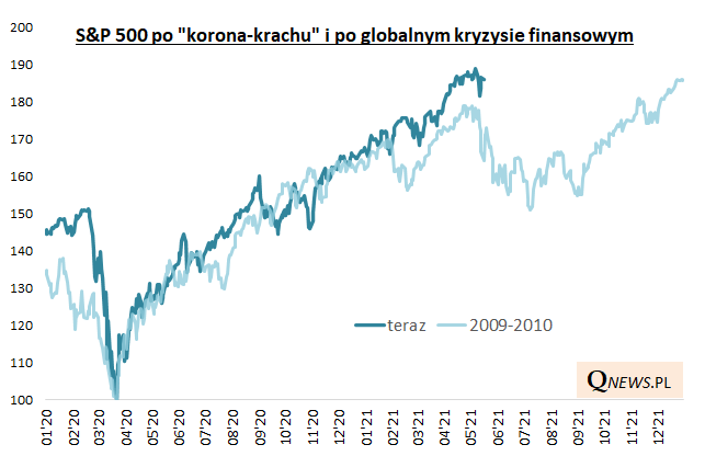 Z kolei Jurrien Timmer z Fidelity Investments przypomina, że przecena z 2010 roku została wywołana bezpośrednio przez zapowiedź wycofania się Rezerwy Federalnej z QE (skupu obligacji). Na razie pod tym względem obecna sytuacja jest zdecydowanie inna - co prawda pojawiły się już przesłanki do myślenia o zaostrzeniu polityki monetarnej (przyspieszająca inflacja), ale Fed zapewnia jeszcze, że jest to zjawisko przejściowe i nie zamierza gwałtownie wycofać się z QE. Warto tu też dodać, że w 2010 roku bank centralny pod presją rynkową szybko powrócił do skupu obligacji (już od sierpnia), co zresztą pomogło we wznowieniu hossy.