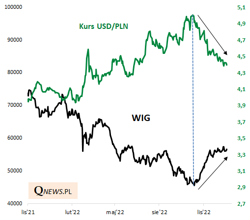 Trwające przez większość roku umacnianie się (aprecjacja) USD względem złotego, jak i innych walut, było skorelowane - zgodnie z tradycją - z uporczywym spadkiem WIG-u. Z kolei od połowy października dolar dla odmiany stopniowo słabnie, pomagając tym samym w odreagowaniu na GPW.
