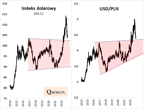 Z drugiej strony analiza techniczna każe zachować pewną ostrożność ze snuciem wizji nieprzerwanego osłabiania się dolara w bliskiej przyszłości. Zarówno kurs USD/PLN, jak i tzw. indeks dolarowy (US Dollar Index) pokazujący notowania USD względem koszyka innych najważniejszych walut, powróciły już w pobliże kilkuletniej formacji "trójkąta", z której wcześniej wybiły się górą w okolicy maja. Górna linia tej formacji to obecnie poziom wsparcia, który mógłby teoretycznie stanowić barierę dla spadku notowań dolara.