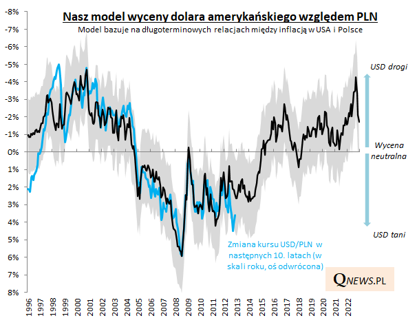 Jak dolar prezentuje się po ostatniej przecenie z fundamentalnego i technicznego punktu widzenia? Nasz model wycenowy, oparty na relacjach między inflacją w Polsce i USA, w październiku sygnalizował silne przewartościowanie dolara, które od tego czasu zostało w połowie skasowane. Innymi słowy, po jesiennej deprecjacji USD jest ciągle przewartościowany, ale nie tak mocno jak dwa miesiące temu. Teoretycznie jest ciągle miejsce do deprecjacji dolara w horyzoncie wielomiesięcznym (co mogłoby pomóc krajowym akcjom).