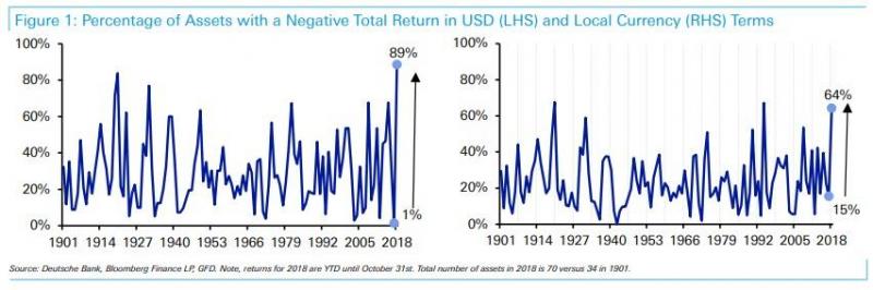 Po bardzo nerwowym na rynkach finansowych październiku analitycy Deutsche Banku zwrócili uwagę, że w pierwszych dziesięciu miesiącach tego roku rekordowy odsetek monitorowanych przez nich 60. rozmaitych aktywów z całego świata przynosi ujemne stopy zwrotu, przynajmniej w ujęciu dolarowym (czyli z punktu widzenia amerykańskiego inwestora).