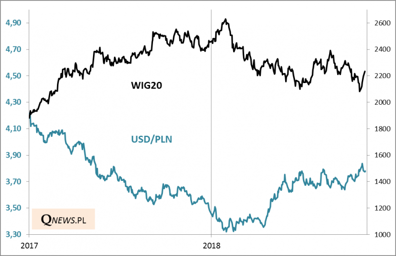- Nie przez przypadek na drugim biegunie znalazły się z kolei polskie akcje. Wielokrotnie dowodziliśmy, że stopy zwrotu z akcji na GPW są na ogół ujemnie skorelowane ze zmianami kursu USD.
