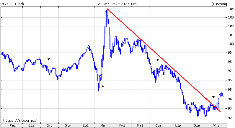 Wrzesień przyniósł pierwszy od marca-kwietnia silniejszy wzrost notowań dolara, czemu nieprzypadkowo towarzyszyła korekta cen ryzykownych aktywów (o roli dolara jako zabezpieczenia na czasy zawieruchy pisaliśmy wielokrotnie). "Pękła" linia trendu spadkowego wychodząca z marcowego szczytu.