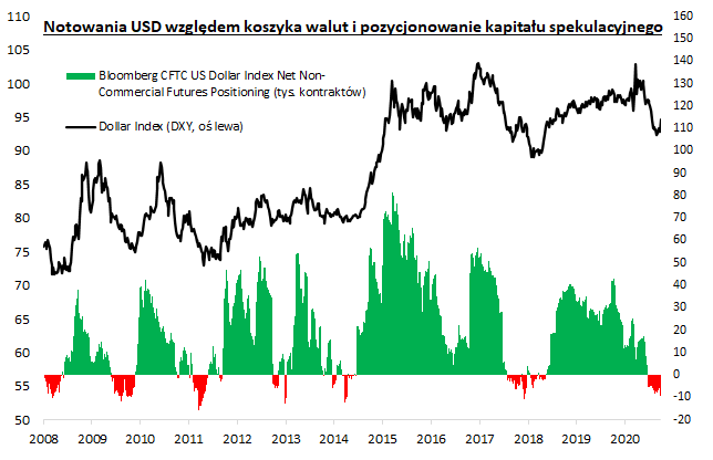 Chociaż krótkoterminowo trudno wywróżyć w którym kierunku rozwinie się sytuacja na wykresie, to jest jednak pewien argument za tym, by cieplej pomyśleć o dolarze (lub ogólnie aktywach denominowanych w dolarze) przynajmniej w nieco dłuższym, wielomiesięcznym horyzoncie inwestycyjnym. Z najnowszych danych CFTC wynika, że USD jest obecnie bardzo nielubiany przez kapitał spekulacyjny. Pozycje spekulacyjne netto w kontraktach na DXY są ujemne, co oznacza, że więcej traderów gra na spadek niż wzrost kursu dolara. Kiedy historycznie mieliśmy do czynienia z taką sytuacją, był to często okres kształtowania się ważnego dna w notowaniach indeksu dolarowego (przełom 2017/18, 2014, 2011, 2009, 2008).