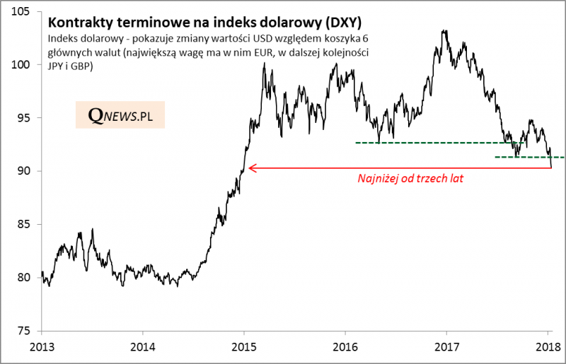 Popularny indeks dolarowy przełamał kolejny techniczny poziom wsparcia i znalazł się najniżej od trzech lat.