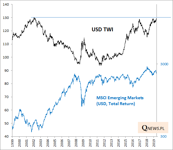 Reasumując, umacnianie się dolara wywołuje negatywne efekty w przypadku tradycyjnie ujemnie skorelowanych z nim klasach aktywów (złoto, emerging markets - stąd też prosta droga do GPW). Ale pamiętajmy, że wystarczyłoby aby ten trend choć na chwilę się odwrócił, a te efekty też ulegną odwróceniu o 180 stopni - próbką tego był rok 2017 (dolar skorygował się w dół, akcje na EM i GPW wystrzeliły w górę).