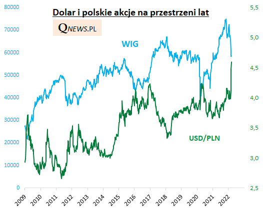Jednym z motywów, jakie od lat przewijają się w naszych analizach, jest znaczenie dolara amerykańskiego dla portfela polskiego inwestora. Kluczowe jest to, że na ogół notowania USD względem PLN są ujemnie skorelowane z cenami polskich aktywów (szczególnie akcji, ale często też obligacji). Dalsza implikacja jest taka, że dla celów dywersyfikacji warto w portfelu mieć nie tylko polskie aktywa, lecz również zagraniczne, denominowane w dolarze i innych "twardych" walutach. Koncepcja ta doskonale sprawdza się w obecnej burzliwej sytuacji wywołanej przez agresję putinowskiego reżimu - kurs USD wystrzelił w górę, co dla polskiego inwestora oznacza zyski z zagranicznych aktywów w przeliczeniu na PLN, a jednocześnie swoiste zabezpieczenie przed deprecjacją polskich akcji.