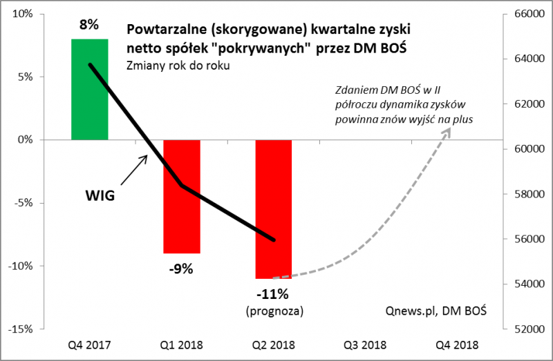 Ale jest też dobra wiadomość - być może najgorsze za nami. "Podtrzymujemy oczekiwania, że roczna dynamika zagregowanych powtarzalnych zysków analizowanych przez nas spółek wyjdzie na plus w drugiej połowie roku" - prognozuje DM BOŚ.
