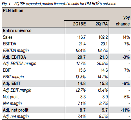 Już niebawem początek kolejnego sezonu publikacji wyników finansowych przez spółki na GPW. Ciekawe przemyślenia w tym zakresie ma sztab analityków DM BOŚ. Według nich zakończony II kwartał przyniósł dalsze pogorszenie zagregowanych wyników. Tzw. "powtarzalne" (recurring) zyski (czyli skorygowane o jednorazowe zdarzenia) były wg prognoz o 11% niższe niż w analogicznym kwartale 2017.