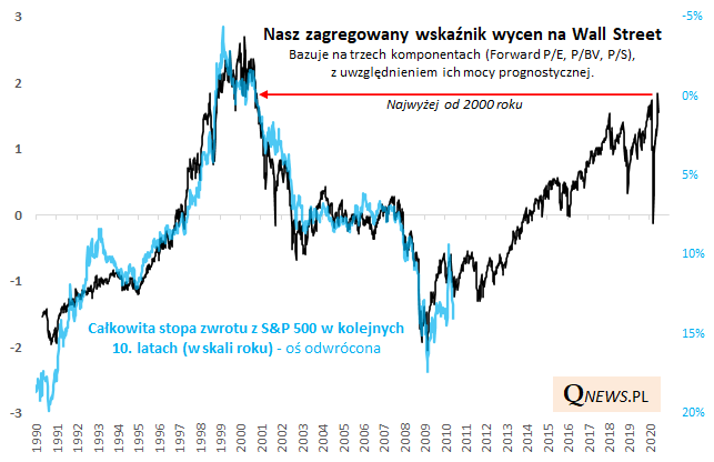 O ile jak dowiedliśmy w jednej z niedawnych analiz Forward P/E ma relatywnie niską moc prognostyczną, jeśli chodzi o przyszłe długoterminowe stopy zwrotu, to również pozostałe – bardziej wiarygodne miary wycen – nie prezentują się obecnie zbyt zachęcająco. Cena do wartości księgowej (P/BV) zawędrowała do poziomu najwyższego od 2001 roku. Cena do sprzedaży (P/S) powraca ku historycznemu rekordowi sprzed „korona-krachu”. Ogółem nasz zagregowany wskaźnik wycen obejmujący te trzy miary zawędrował do poziomu najwyższego od … 2000 roku. I implikuje długoterminowe (10-letnie) stopy zwrotu z S&P 500 na poziomie lekko powyżej zera (!).