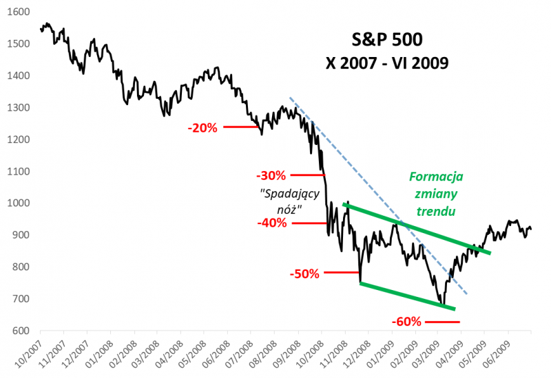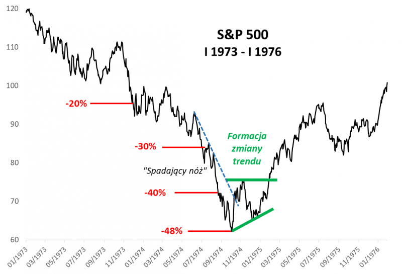 Reasumując, nasza główna konkluzja na podstawie analizy przebiegu wybranych historycznych trendów spadkowych na Wall Street jest taka, że pomiędzy gwałtowną przeceną („spadający nóż”), a hossą występowała zawsze konsolidacja czy też okres przejściowy.