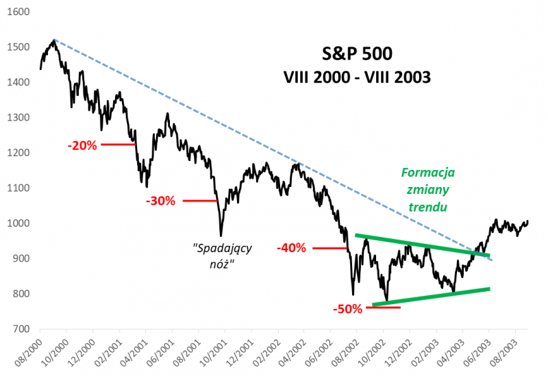 Stosunkowo dobrą wiadomością w tym względzie jest fakt, że na pełne zrealizowanie takiego potencjału spadkowego potrzeba było sporo czasu – nawet wiele miesięcy. Te najgłębsze bessy dzieliły się na rozciągnięte w czasie fale zniżkowe oraz fale odreagowania. Najbardziej klasyczna pod tym względem była bessa z lat 2000-02, kiedy inwestorzy mieli do czynienia z trzema wielkimi falami zapaści, z których każda kończyła się paniką w stylu „spadającego noża”, z jaką również ostatnio mamy do czynienia. Te fale były przerywane odreagowaniem, które jakkolwiek mocne, w pewnym momencie traciło impet i bessa powracała.