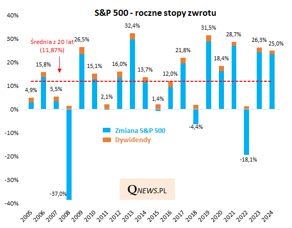 Dla akcji amerykańskich był to drugi z rzędu niezwykle udany rok. Indeks S&P 500 urósł o 23,3 proc., zaś po dodaniu dywidend całkowita stopa zwrotu (Total Return) wyniosła 25,0 proc. To wynik niemal dorównujący temu z 2023.