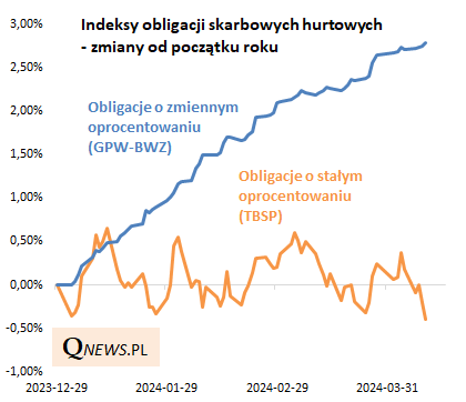 Reasumując, utrzymywanie relatywnie wysokich stóp procentowych w Polsce i niejasne perspektywy ewentualnych obniżek w USA i strefie euro przekładają się na wyraźną zadyszkę obligacji stałokuponowych. Z kolei obligacje zmiennokuponowe cały czas korzystają właśnie na wysokich stopach procentowych.