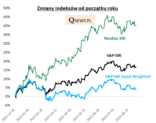 Po raz kolejny w tym roku powraca temat tzw. szerokości (ang. breadth) hossy na Wall Street. O ile jeszcze w lipcu wydawać się mogło, że tzw. szeroki rynek akcji zaczyna wreszcie podążać w górę, w ślad za rosnącymi dynamicznie (na fali nadziei związanych z rozwojem sztucznej inteligencji) kursami technologicznych gigantów, to od sierpnia rozwój wydarzeń znów okazuje się rozczarowaniem. Podczas gdy technologiczny Nasdaq-100 jest ok. 40 proc. na plusie od początku roku, a - będący również pod dużym wpływem spółek z tej grupy - S&P 500 jest 16 proc. na plusie, to wersja tego drugiego indeksu, w której każda spółka ma identyczną wagę - czyli S&P 500 Equal Weighted Index - jest zaledwie ok. 4 proc. nad kreską. Ten ostatni indeks nie jest zdominowany przez garstkę największych korporacji i przez to lepiej oddaje sytuację na tzw. szerokim rynku.