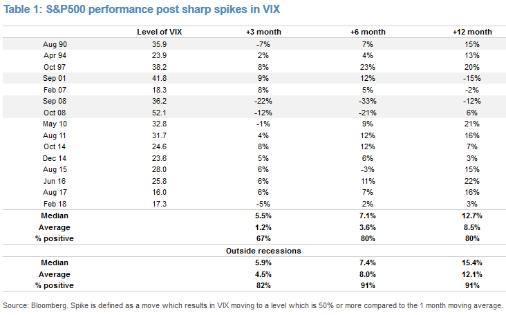 Eksperci skupili się jednak nie tyle na poziomie, do jakiego dotarł VIX w trakcie skoku, lecz na samym skoku, który zdefiniowali jako wzrost VIX-a o co najmniej 50% względem miesięcznej średniej kroczącej. Po zbadaniu podobnych historycznych przypadków doszli do wniosku, że w zdecydowanej większości takich przypadków ceny akcji (S&P 500) były wyżej 6 i 12 miesięcy później. Najpoważniejszym odstępstwem od tej normy był kryzys finansowy w 2008 roku. Jeśli zaś w ogólne pominąć przypadki recesyjne (gdy rynek akcji spadał w związku z recesją - J.P. Morgan zakłada, że nie mamy do czynienia z takim przypadkiem), akcje były droższe w ponad 90% przypadków po upływie 6. i 12. miesięcy od omawianego wyskoku VIX-a.
