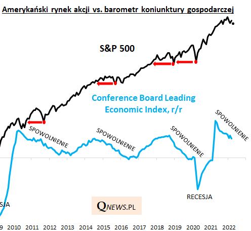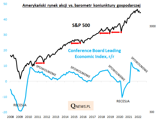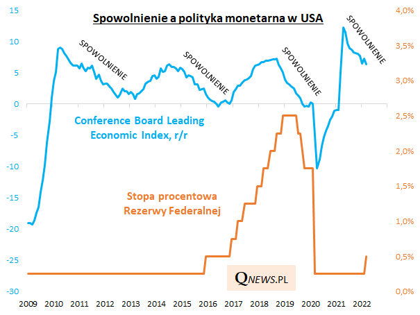 Reasumując, amerykański barometr koniunktury Leading Economic Index (LEI) jest daleki od wróżenia recesji (to plus), ale jednocześnie sygnalizuje postępujące spowolnienie, które historycznie potrafiło odbijać się czkawką rynkowi akcji. Oliwy do ognia dolewa tym razem nietypowe zachowanie Fedu, który wcześniej przespał dobry moment na normalizację polityki monetarnej w trakcie gwałtownego przyspieszenia w gospodarce, a teraz zabiera się za podwyżki stóp procentowych w warunkach spowolnienia.