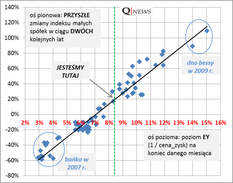 - oparta na tej analizie prognoza sama w sobie nie mówi nic na temat krótkoterminowych perspektyw – to że w ciągu dwóch lat indeks małych spółek może urosnąć o 20% równie dobrze może oznaczać np., że w obu latach urośnie po niecałe 10%, jak i np. że najpierw spadnie o 10% (co oznaczałoby dalszy wzrost EY, czyli dalsze uatrakcyjnienie wycen) i dopiero w drugim roku urośnie o ponad 30%.