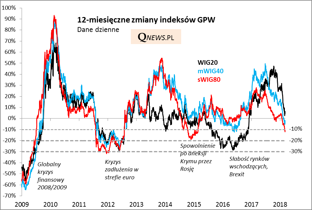 Lutowa przecena, a potem brak jej mocnego odreagowania przyczyniły się do przyspieszenia pewnego trendu na GPW, który obserwujemy już od połowy 2017 roku. Chodzi o stopniowe obniżanie się wskaźników rocznej (12-miesięcznej) dynamiki głównych indeksów giełdowych.