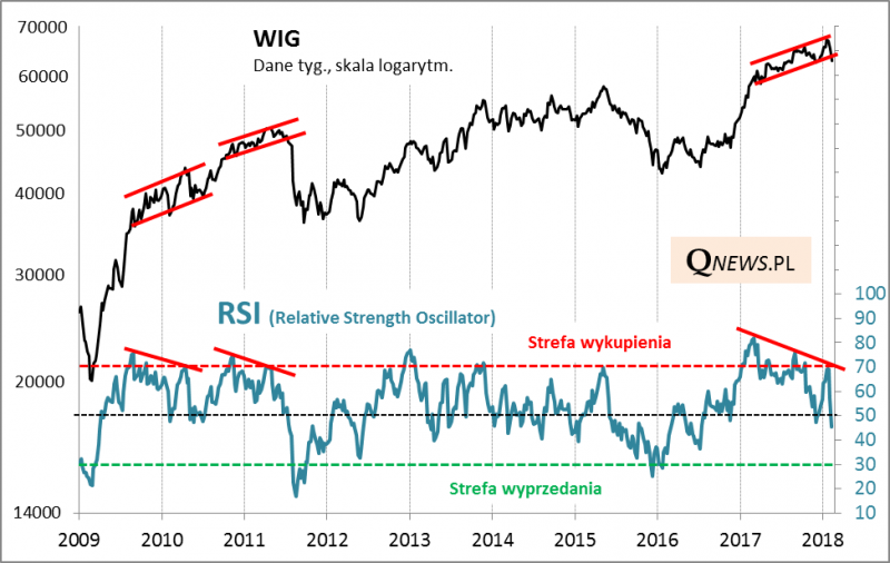 Na wykresie uwagę zwraca jeszcze jedna kwestia - już od roku kolejne lokalne górki RSI położone są coraz niżej, podczas gdy WIG w tym samym czasie stopniowo wspinał się na coraz wyższe pułapy. Podręcznikowo taką sytuację określa się jako negatywną dywergencję (rozbieżność), co potencjalnie może oznaczać ciąg dalszy kłopotów.