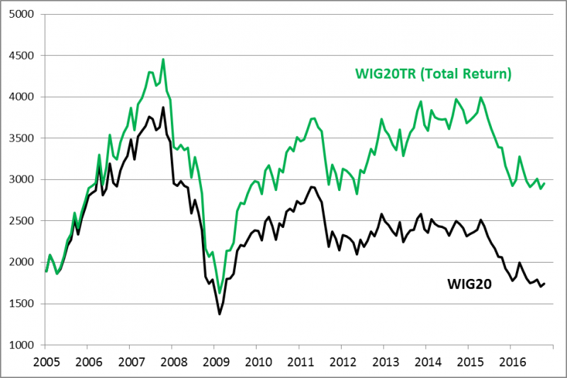 Na słabą formę flagowego indeksu WIG20 można słusznie narzekać. Indeks na przestrzeni ostatnich kilkunastu miesięcy zbliżył się do dołka z początku 2009 roku. Warto jednak pamiętać, że w swej podstawowej wersji indeks ten nie uwzględnia dochodów z dywidend. Tymczasem te dochody na dłuższą metę mają kolosalne znaczenie. "Lepsza" wersja, w której dywidendy powiększają wartość WIG20, jest na poziomie dołków nie z 2009 roku, lecz z przełomu lat 2011/2012. A jak pokazuje wykres, to różnica niebagatelna.
