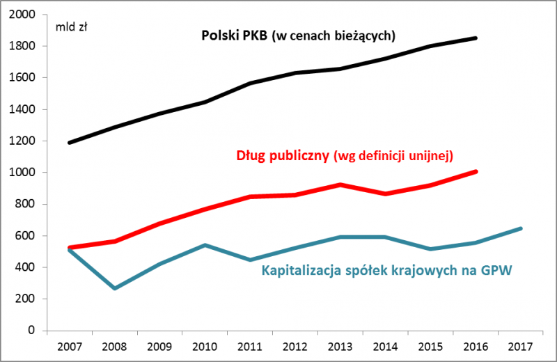 • Polski dług publiczny według definicji unijnej (dług sektora instytucji rządowych i samorządowych) urósł o ponad 90 proc. (2007 vs. koniec 2016) i przekroczył 1 bilion złotych. W ujęciu relatywnym dług urósł z ok. 44 proc. PKB do ponad 54 proc. PKB – i to nawet mimo odebrania OFE, a następnie umorzenia obligacji skarbowych. Niestety i tutaj spodziewać się można kontynuacji negatywnego trendu, a nawet jego przyspieszenia w razie cyklicznego spowolnienia w gospodarce.