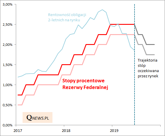 Rynek nie zakłada, by do cięcia miało dojść już dzisiaj. Fed raczej będzie skłonny poczekać przynajmniej na rozwój wydarzeń w zakresie wojen handlowych - pod koniec miesiąca może się rozstrzygnąć czy prezydent Trump nałoży kolejne cła na chińskie produkty, czy jednak będzie dążył do kompromisu. Będzie to z pewnością miało wpływ na to czy do pierwszej obniżki dojdzie na posiedzeniu pod koniec lipca - a takie są aktualne oczekiwania rynkowe. Wg nich drugie cięcie pojawi się we wrześniu. Podzielone są zaś opinie na temat trzeciej obniżki w grudniu.