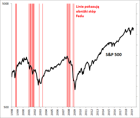 W tym wszystkim uderzające jest to, że o ile rynek kontraktów na stopy oraz rynek obligacji dyskontują - a można odnieść wrażenie, że wręcz "wymuszają" - obniżkę stóp już w lipcu, to sytuacja na rynku akcji nie wygląda tak, jakby taka obniżka w ogóle była konieczna. Indeks S&P 500 jest nieopodal rekordu wszech czasów.