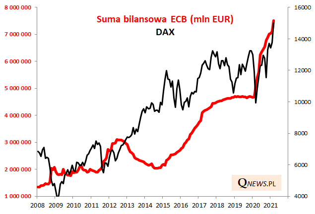 Gwałtowny wzrost sumy bilansowej ECB w ostatnich kilkunastu miesiącach zbiegł się w czasie z potężnym odbiciem na europejskim rynku akcji. Na dłuższą metę, jak pokazuje poniższy wykres, relacja między działaniami europejskich władz monetarnych, a koniunkturą giełdową nie jest jednoznaczna (w grę wchodzą też np. zyski spółek), choć zaryzykowalibyśmy tezę, że utrzymanie QE to raczej dobra niż zła wiadomość dla rynków akcji.