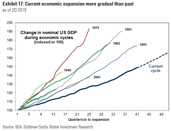 Te rekordy oczywiście uzasadniają trwającą debatę na temat tego czy kolejna recesja już gdzieś czyha za rogiem. Tegoroczne odwrócenie krzywej rentowności obligacji również wpisuje się w te rozważania. Z drugiej strony Goldman Sachs zwraca uwagę, że chociaż ekspansja w gospodarce USA jest rekordowo długa, to jednak jest również wyjątkowo powolna. Zdaniem strategów GS to ma swoje zalety - nie dostrzegają obecnie "zbyt wielu" oznak niebezpiecznej nierównowagi w gospodarce.