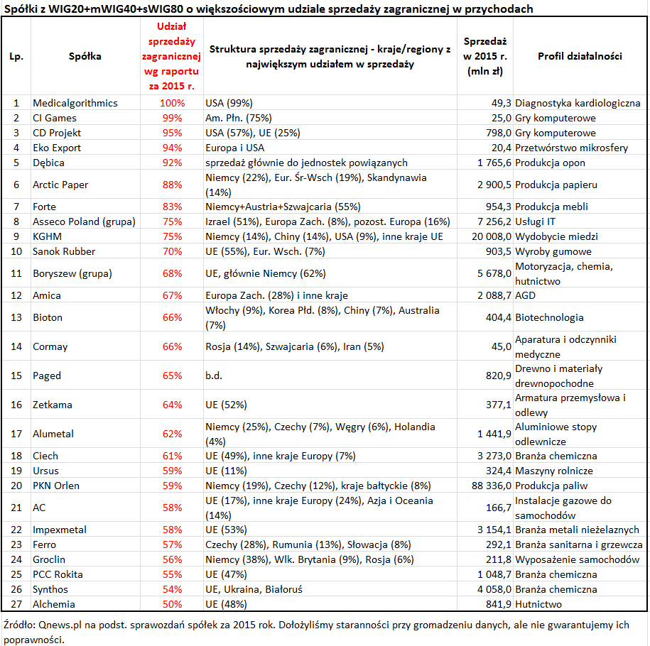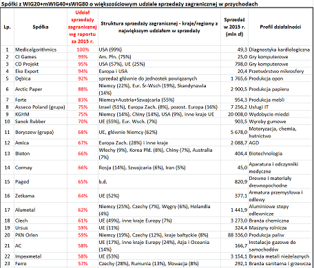 Spośród tej licznej gromady wyłoniliśmy te spółki, które mają większościowy (co najmniej 50-proc.) udział sprzedaży zagranicznej w całych przychodach netto ze sprzedaży. Doliczyliśmy się 27. takich przedsiębiorstw (oczywiście w skali całej GPW, poza trzema głównymi indeksami, jest ich prawdopodobnie dużo więcej). I tu od razu uwaga – nie jest to oczywiście ranking największych eksporterów (o największej sprzedaży zagranicznej w ujęciu nominalnym), bo taki ranking miałby bardziej charakter statystyczny, niż inwestycyjny. W naszej analizie chodziło raczej o wyłowienie tych przedsiębiorstw, które w największym stopniu są nastawione na sprzedaż zagraniczną, niezależnie od ich wielkości.