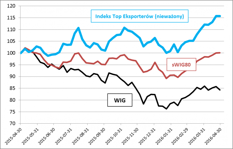 A jak zachowują się notowania eksporterów? Widoczny na wykresie indeks nieważony (w którym każda ze spółek startowała z takim samym udziałem początkowym) na przestrzeni ostatnich dwunastu miesięcy sprawował się wyraźnie lepiej nie tylko niż szeroki WIG (obciążony słabością rynków wschodzących oraz krajową polityką), ale też lepiej, niż kojarzony głównie z małymi spółkami sWIG80.