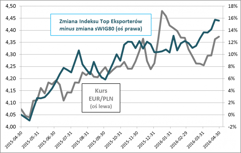 Rys. 2. Zmiany kursu PLN a siła relatywna Indeksu Top Eksporterów