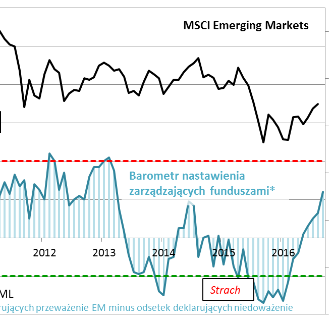 Pytanie jednak czy ten apetyt nie jest już zbyt duży? Jeśli odwołać się do historii, to jego poziom jest raczej przeciętny. Czyli innymi słowy, jest ciągle teoretycznie sporo miejsca do kontynuacji poprawy humorów zarządzających i inwestorów (a co za tym idzie - do zwiększenia udziału emerging markets w globalnych portfelach). W okresie euforii z przełomu lat 2010/2011 barometr nastrojów był na poziomach ponad dwa razy wyższych niż obecnie. Oczywiście nie oznacza to, że nie obędzie się bez przejściowych korekt i podwyższonej zmienności.