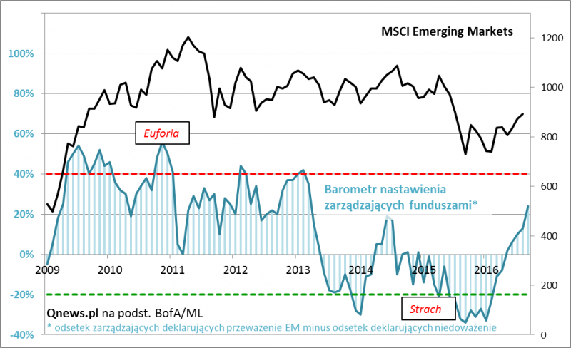 Wystarczył rok, by nastawienie globalnych zarządzających względem akcji z rynków wschodzących uległo odwróceniu niemal o 180 stopni. Kiedy 12 miesięcy temu pisaliśmy o możliwym przełomie na emerging markets, była to najbardziej znienawidzona klasa aktywów (obok surowców) - rekordowy odsetek menedżerów funduszy ankietowanych przez Bank of America/Merrill Lynch deklarował jej niedoważanie (czyli udział w portfelach poniżej przyjętej długoterminowej normy). Jakże odmienna jest obecna sytuacja. Według najnowszego, wrześniowego sondażu BofA/ML po tamtej niechęci nie ma już najmniejszego śladu. Dość pokaźna zwyżka indeksu MSCI Emerging Markets (+14% od początku roku) i jego lepsze zachowanie w porównaniu z tak hołubionymi przed rokiem rynkami rozwiniętymi zdecydowanie poprawiły humory zarządzających. Teraz dla odmiany w wyraźnej przewadze są menedżerowie deklarujący przeważenie (udział ponadnormatywny) akcji z rynków wschodzących w portfelach. Mierzony w ten sposób apetyt jest największy od 3,5 roku!