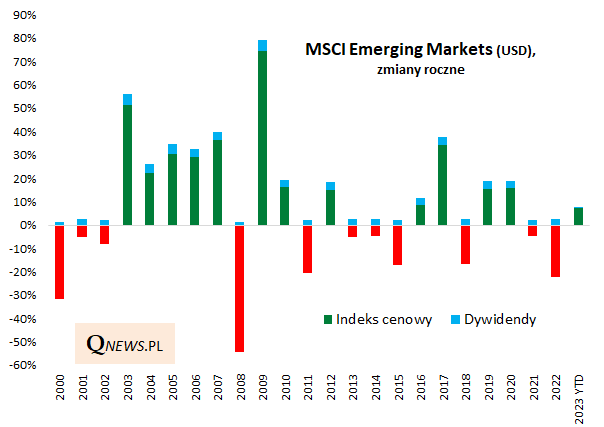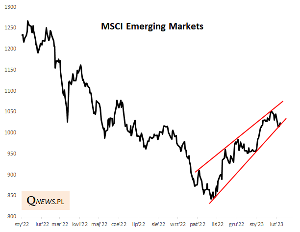 Po dwóch słabych latach (bessa zaczęła się tu już w I kw. 2021) indeks rynków wschodzących może zaliczyć pierwsze tygodnie 2023 roku do udanych (do 9/02 urósł o 7,1 proc. w ujęciu dolarowym). Jako szanse dla emerging markets (EM) wymieniane są czynniki takie jak oczekiwany koniec podwyżek stóp procentowych w USA (Fed pivot). Trzeba przyznać, że choć od jesiennego dołka wyceny akcji na EM wyraźnie się już podniosły, to jednak nie są wygórowane (wskaźnik ceny do prognozowanych zysków spółek na poziomie 12,1 na koniec stycznia wobec 10,1 w październiku; prognozowana stopa dywidendy: 3,2 proc.).