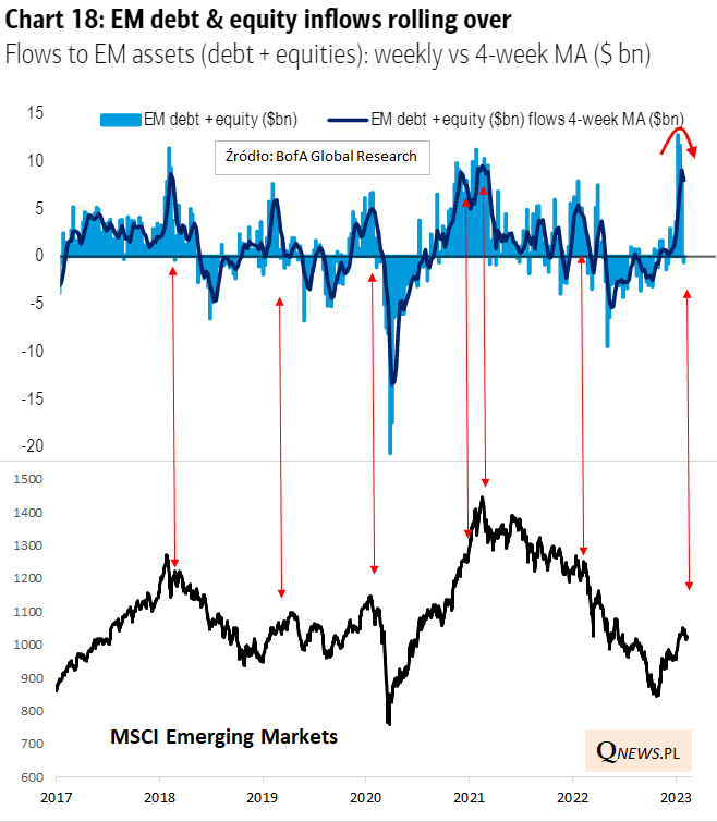 Na wykres BofA nałożyliśmy na własną rękę wykres MSCI EM. Okazuje się, że zakręcanie w dół z tak wysokich pułapów 4-tygodniowej średniej z przepływów liczonej przez BofA na przestrzeni ostatnich sześciu lat (za dłuższy okres nie mamy danych) było często (nie zawsze) poważnym sygnałem ostrzegawczym.