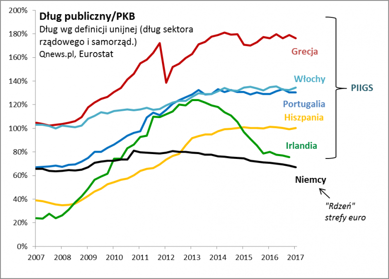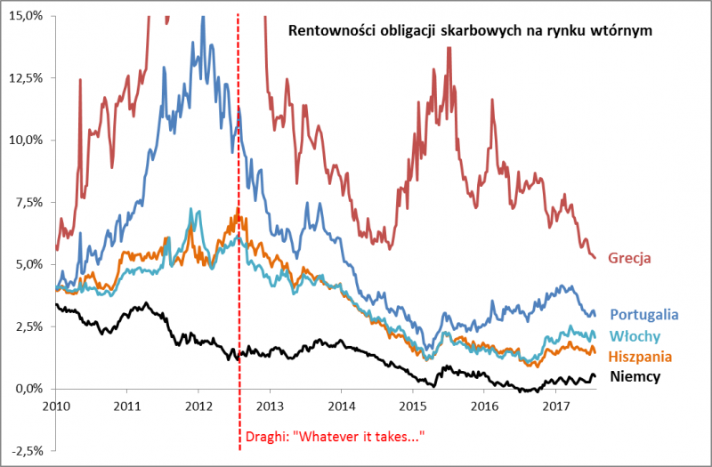 Dziś trochę wspomnień. Dokładnie pięć lat temu (26 lipca 2012), w epicentrum europejskiego kryzysu zadłużenia, Mario Draghi wygłosił słynne słowa: "EBC zrobi wszystko, co w jego mocy, by utrzymać euro". Trzeba przyznać, że Draghi ten cel osiągnął - wbrew mrocznym scenariuszom "Eurogeddonu" nie było, strefa euro nie rozpadła się. Nie "wykruszył się" z niej nawet najsłabszy element, czyli zadłużona po uszy Grecja. A skoro o niej mowa, to właśnie mieliśmy kolejne symboliczne wydarzenie - kraj ten po raz pierwszy od trzech lat zdołał sprzedać inwestorom nowe obligacje. Istota sukcesu EBC tkwi głównie właśnie w utrzymaniu w ryzach rentowności obligacji w krajach eurolandu. Dzięki takiej polityce nie doszło do eksplozji kosztów obsługi długu, która mogłaby doprowadzić do poważnego kryzysu finansowego - i to nie tylko w stosunkowo mało ważnej Grecji, ale nawet we Włoszech.
