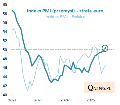 Trudno byłoby przejść obojętnie obok najnowszych odczytów przemysłowych indeksów PMI w strefie euro. Główny indeks (Eurozone Manufacturing PMI) po raz pierwszy od ponad trzech lat wspiął się powyżej pułapu 50 pkt., uznawanego za granicę między kurczeniem się i wzrostem przemysłu. Uwagę zwracają też wskaźniki liczone indywidualnie dla największych gospodarek eurolandu - w Niemczech PMI znalazł się najwyżej od 38 miesięcy (i o kroczek od 50 pkt.), a we Francji najwyżej od 31 miesięcy.