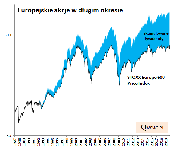 Ale na pocieszenie warto też wspomnieć o niezauważanym często aspekcie - o ... dywidendach. Efekt ich kumulacji i reinwestowania sprawia, że faktyczne stopy zwrotu z europejskich akcji wyglądają na przestrzeni lat znacznie lepiej, niż wynikałoby z wykresu indeksu cenowego. Pod tym względem już teraz notujemy historyczne rekordy.