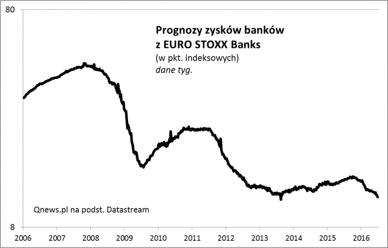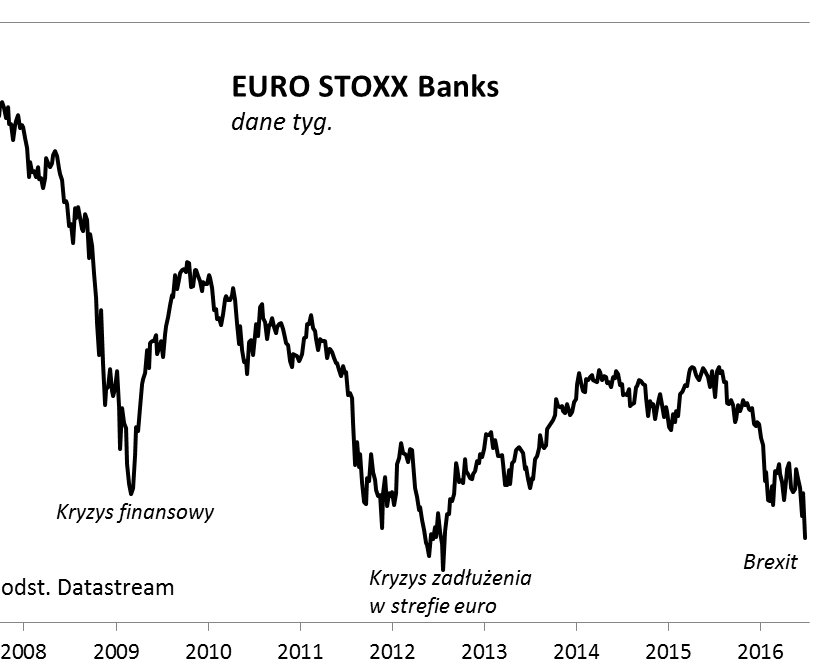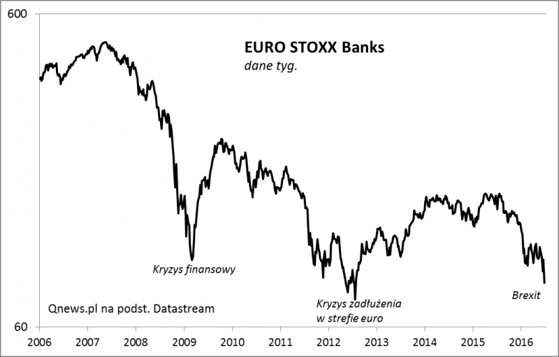 Wśród indeksów, które najbardziej ucierpiały na skutek brytyjskiego referendum, jest ten gromadzący banki ze strefy euro. EURO STOXX Banks, obejmujący trzydzieści największych firm z sektora, mocno zanurkował. Być może ta reakcja nie byłaby aż tak istotna, gdyby nie to, że jest to już kolejny epizod słabości tego sektora. W efekcie indeks znalazł się nieopodal dołków z połowy 2012 roku, czyli najniżej od czterech lat!