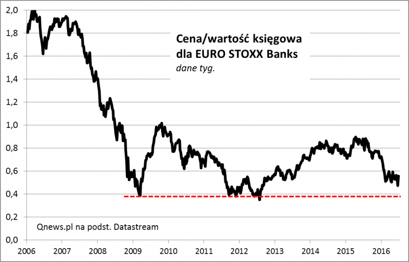 Jeśli szukać jakiegokolwiek pocieszenia, to znaleźć je można w postaci wskaźnika ceny do wartości księgowej. Na przestrzeni ostatnich kilkunastu miesięcy mocno zbliżył się on do dołków z lat 2009 i 2012, kiedy to fale niechęci do sektora osiągały swe punkty kulminacyjne, po czym dochodziło do uspokojenia.