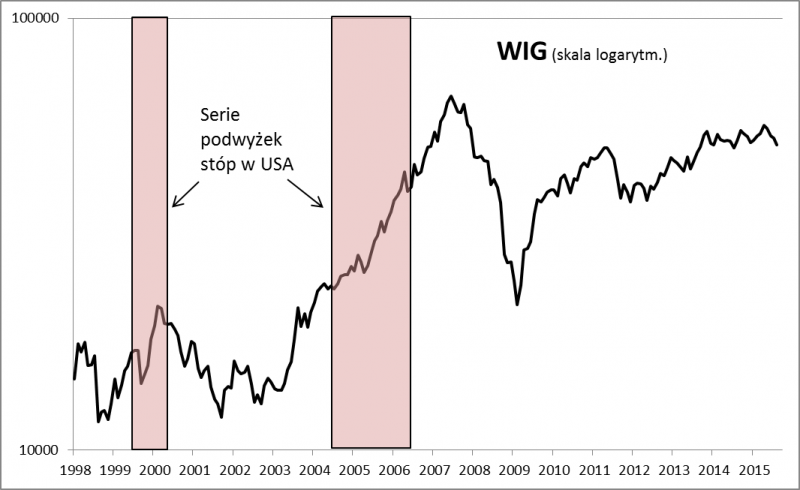Zauważmy, że serie podwyżek stóp w USA nie miały - przynajmniej od razu - jednoznacznie negatywnego wpływu na kierunek trendu na GPW - WIG stopniowo kontynuował wspinaczkę (po drodze oczywiście zdarzały się korekty). Hossy kończyły się albo tuż przed końcem podwyżek (rok 2000), albo wiele miesięcy po ich zakończeniu (rok 2007). Oczywiście obecne uwarunkowania są specyficzne (ostatnie lata stały pod znakiem niekonwencjonalnej, ultra łagodnej polityki, z QE na czele), ale historia pokazuje, że na tym etapie nie jesteśmy skazani na bessę.