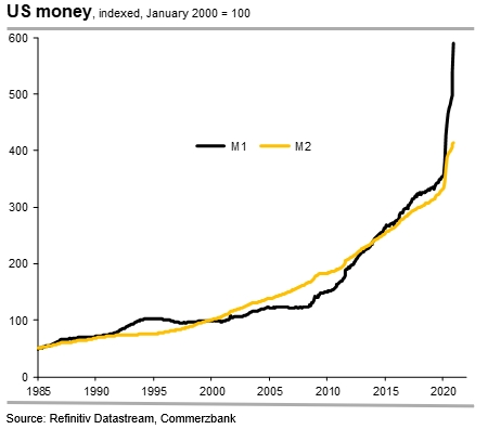 Analitycy Commerzbanku zwracają uwagę na bezprecedensowy przyrost podaży pieniądza (money supply, M) w gospodarkach rozwiniętych, w szczególności w USA. Jak pokazuje poniższy wykres, podstawowy (najbardziej płynny) agregat podaży pieniądza M1 (suma m.in. gotówki w obiegu i depozytów na żądanie) jeszcze nigdy nie rósł w takim tempie. Nasze własne obliczenia pokazują, że od czasu "korona-krachu" M1 powiększył się o prawie 3 biliony dolarów, z 4 do blisko 7 bln USD na koniec stycznia. Dla porównania, wzrost z 3 do 4 bln USD zajął wcześniej ... pięć lat.