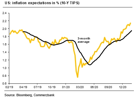 Podstawowe pytanie brzmi: kiedy Fed (i inne banki centralne) zacznie bać się wyższej inflacji, co mogłoby przełożyć się na odejście od ultra ekspansywnej polityki? Commerzbank wskazuje, że w przeszłości wzrost oczekiwań inflacyjnych przekładał się na coraz mniej "gołębią" retorykę Rezerwy Federalnej. Ale tym razem reakcja może być bardziej opóźniona, bo w zeszłym roku Fed ogłosił bardziej tolerancyjne podejście do inflacji. Niemniej dalszy wzrost oczekiwań to zdaniem Commerzbanku czynnik ryzyka na ten rok.