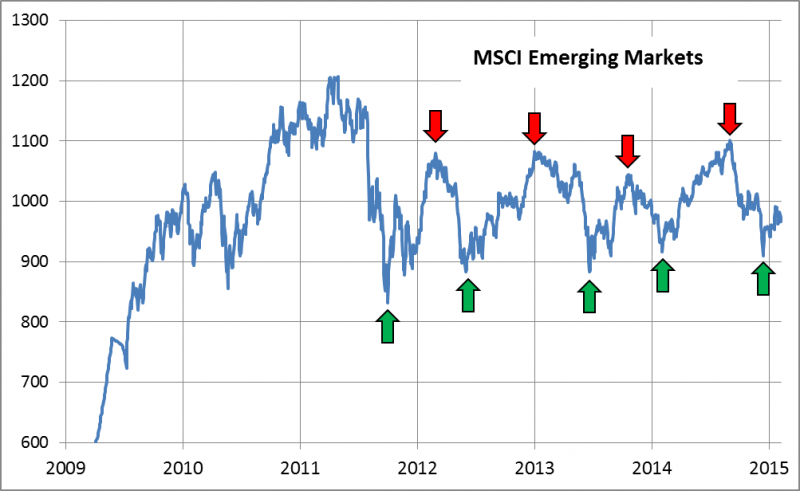 W połowie grudnia ub.r. indeks MSCI Emerging Markets ustanowił średnioterminowy dołek i od tej pory - ze zmiennym szczęściem - próbuje wspinać się na wyższe poziomy. Warto zwrócić uwagę, że wszystko to rozgrywa się w ramach rozległego, kilkuletniego trendu bocznego. Z tego względu obecną próbę podniesienia notowań można porównać do czterech podobnych ruchów zwyżkowych, które miały na przestrzeni ponad trzech lat.