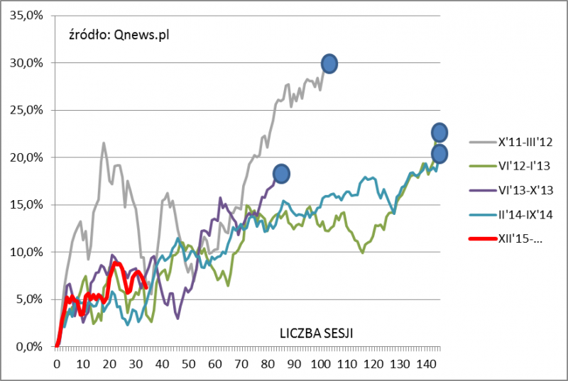Takie porównanie pozwalać sobie zdać sprawę, że wszystkie średnioterminowe fale wzrostowe rodziły się w bólach, przy dość silnej zmienności i obecna sytuacja nie jest pod tym względem wyjątkiem. Zestawienie historycznych przypadków pozwala jednak także zauważyć, że poszczególne fale trwały od 17 do 29 tygodni. To pozwala sądzić, że w najgorszym przypadku obecne zwyżki dobiegną końca za jakieś 10 tygodni (II połowa kwietnia), a w najlepszym - za 22 tygodnie.