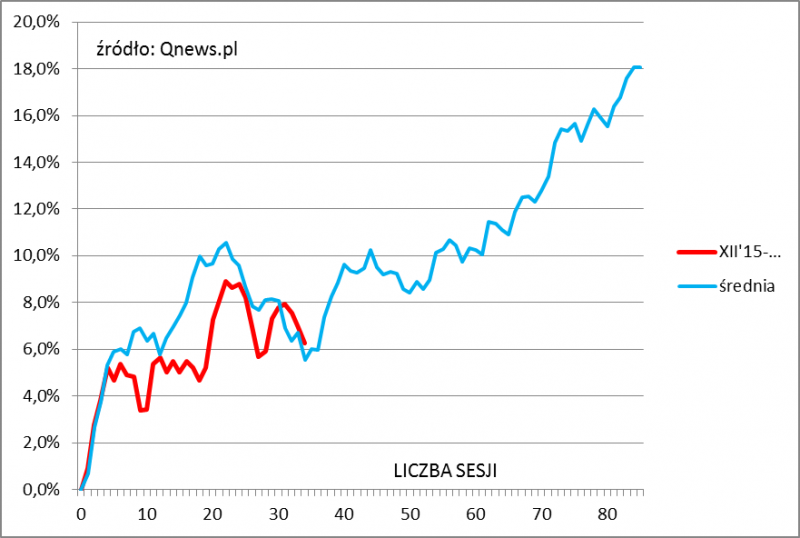 Ciekawostką jest to, że jeśli wyciągniemy średnią z historycznych przypadków, to okaże się, że fala wzrostowa rozpoczęta w połowie grudnia ub.r. jest bardzo zbliżona do takiej uśrednionej historycznej ścieżki, po jakiej kroczył MSCI EM.
